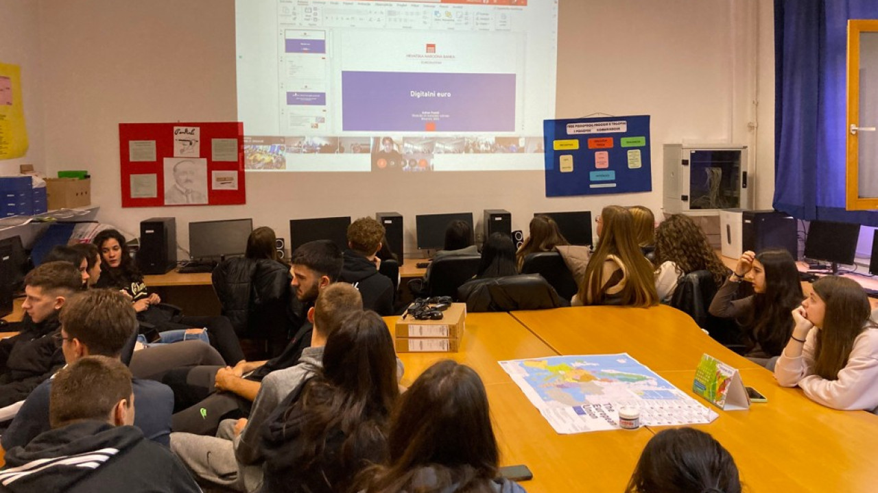 Online predavanje na temu 'Digitalni euro' organizirano je u suradnji s Hrvatskom narodnom bankom s ciljem edukacije učenika i nastavnika o budućnosti digitalnog plaćanja i sigurnosti u suvremenom platnom prometu.